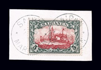 1854 O 29 image#29, 1901 5M Slate and carmine, neatly tied to piece by full strike of "Saipan/Marianen/13 6 06" c.d.s., bright colors, very fine; signed Kosack (Michel #19; €600). (Image) $400.00