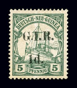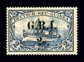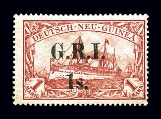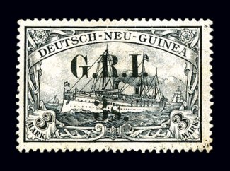 1857 og 14 image#14, 1914 3/- on 3M Blackish violet, narrow 4mm spacing, fresh and attractive mint single with sharp and detailed surcharge, well centered, o.g., relatively lightly hinged, unusual traces of extraneous printing ink of the stamp showing mostly in the margins, very fine and choice; it is believed that only 35-48 of this value of German New Guinea were surcharged of the combined both spacings; signed Kosack (S.G. #14; £3,250). (Image) $3,500.00