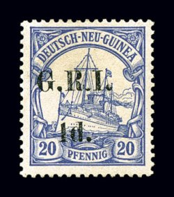 1860 og 19d image#19d, 1914 1p on 20pf Ultramarine, error surcharge, fresh and unusually attractive mint single of this value that was supposed to be surcharged 2p or 2 1/2p, beautifully centered, strong color on bright paper, o.g., lightly hinged, very fine and remarkably choice; It is not known how many of this error were printed but their rarity is reflected in how seldom this value is offered; 1933 BPA certificate (S.G. #19m; £5,500). (Image) $3,000.00