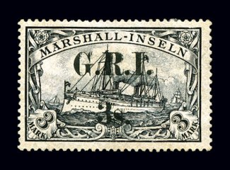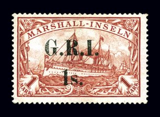 1864 og 29C image#29C, 1914 5/- on 5M Slate and carmine, wide 5 1/2mm spacing, Gibbs second setting, position 2, beautifully centered mint example of this incredibly rare high value, intense brilliant colors, o.g., extremely fine; this is by far the rarest of the regularly issued, non-error stamps of New Britain, only 30-35 5M stamps total of both spacings were believed to have been issued, in addition this is clearly from position 2 of the second setting with a deformed period after the "G" and interestingly a strongly impressed large round period after "I"; Gibbs considers the reported issuance of only seventeen 5M stamps being surcharged of both spacings from settings 1 and 2 to be correct making this an incredible rarity beyond its already rare status, and to be in such impressive condition as well is even more phenomenal; signed Champion, Friedl and H. Bloch, plus accompanied by a 1960 Friedl certificate (S.G. #30; £18,000). (Image) $25,000.00