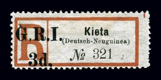 1872 og 43, 43f image#43f, 1914 3p Surcharge on black and red Rabual Registration label, double surcharge, vertical strip of three, the error being the center stamp, Gibbs setting C, position 5, exceptionally well centered, full o.g., the error stamp being never hinged, vertical crease quite typical of the flimsy paper of these labels, small corner missing from bottom stamp, error stamp has full even perforations and extremely fine appearance; incredibly rare with only two horizontal strips of five so printed, making a total of ten issued, one of which is a variety without bracket (Image) $2,000.00