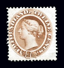 1880 nh 28a image#28a, 1865 12c Pale red brown on thin yellowish paper, fresh rich color, o.g., n.h., fine; photocopy of a 2005 Greene Foundation certificate for a block of four, this being the bottom right stamp (Unitrade for hinged C$225.00). (Image) for hinged $425.00