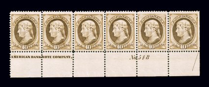 641 og/nh 209 image#209, 10c Brown, a handsome full bottom margin imprint and plate "No. 548" strip of six, exceptionally fresh with bright color, each stamp with large margins and rather well centered for a multiple, full clean o.g., two center stamps n.h., others lightly hinged, a very fine and choice Bank Note plate number strip; 1999 PF certificate; cataloged as six singles. (Image) $1,710.00+
