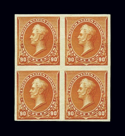 648 ogbl 219c-29a image#219c-229a, 1c-90c Small Bank Notes, imperforate, a beautiful set of mint blocks of four, all with large margins all around and brilliant color, full o.g., lightly hinged (some stamps are never hinged), extremely fine; a rare set of blocks, and to try to assemble a finer set would be an immense challenge; 15c and 90c accompanied by 1993 PF certificates. (imagea) (imageb) (Image) $11,270.00+