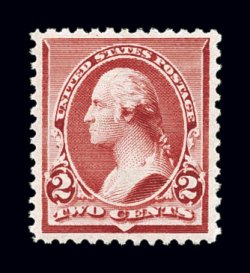 649 nh 220a image#220a, 2c Carmine, cap on left "2" variety, pristine mint example of this popular variety, radiant color and a deeply etched impression on immaculate paper, wonderfully well centered with uncharacteristically large margins all around, unblemished o.g., n.h., extremely fine: a surprisingly difficult stamp in this gem condition; 1999 PF certificate. (Image) $400.00