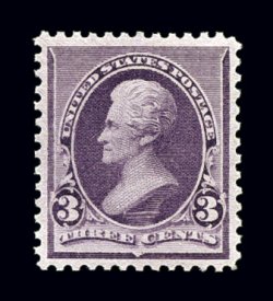 650 nh 221 image#221, 3c Purple, essentially perfect centering, huge balanced margins all around, plus crisp even perforations, luxuriously rich color and impression on immaculate paper, pristine o.g., n.h., extremely fine in every respect; an impressive large-margined gem; 1997 PF certificate (Image) $225.00