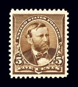 651 og 223 image#223, 5c Chocolate, incredibly well centered amid lavishly large margins, lovely rich color and impression on crisp paper, o.g., faint trace of hinging, extremely fine; 1994 PF certificate for a top sheet-margin single whose selvage has been subsequently removed (specifically stating that the stamp is never hinged). (Image) $95.00