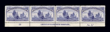 662 nh 233 image#233, 4c Columbian, bottom margin imprint, letter "D" and plate "No. 17" strip of four, incredibly fresh and crisp, with especially intense color on bright paper, well centered, o.g., n.h., very fine and handsome strip; catalog value is for four never hinged singles. (Image) $800.00+