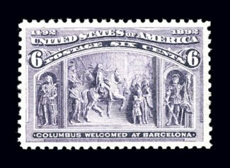 666 nh 235 image#235, 6c Columbian, outstanding centering within large margins, strong rich color, o.g., n.h., the PSE certificate states "o.g., never hinged with a glazed spot at the lower right", which is unduly harsh, as the spot is barely perceptible, extremely fine; clear 1992 PF certificate and a 2005 PSE certificate. (Image) $195.00