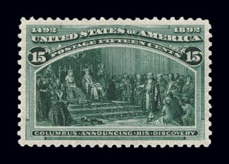 670 nh 238 image#238, 15c Columbian, a fabulous quality mint example that is the epitome of a "post office" fresh gem, possessing flawless centering amid extravagantly large margins which are most atypical of this value, brilliantly fresh as well, with sumptuously rich color and a deeply etched impression, immaculate o.g., never hinged, extremely fine; a superb stamp that is destined to realize an impressive price; 1990 and 2001 PF certificates; ex-Floyd. (Image) 625.00