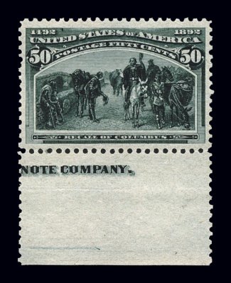 673 nh 240 image#240, 50c Columbian, bottom sheet-margin partial imprint single, extraordinarily well centered, deep luxuriant color and an especially vivid impression, o.g., never hinged, extremely fine; select quality never hinged Fifty Cent Columbians are quite rare; 1998 PF certificate for a block of four, this being the bottom right stamp. (Image) $1,700.00