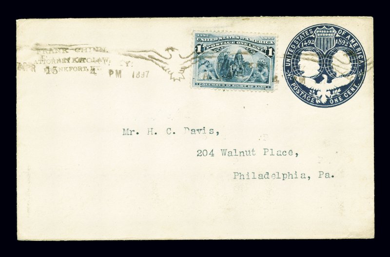 677 c 230 image#230, 1c Columbian, tied by rare Apr. 15, 1897 Milan and Holmes Eagle cancel of Frankfurt, Ky. repeated twice on 1c Columbian entire (#U348), sent to Philadelphia, very fine; this is considered the most important fancy cancel on the Columbian Issue, as well as being one of the most sought-after machine cancels on any issue. (imagea) (Image) Est. 1,000-1,500