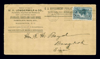 679 c 230 image#230, 1c Columbian, tied by Washington, D.C., Jun. 21, 1895 machine cancel on cover to Bangkok, Siam, with book dealer's corner card, New York transit, small sealed tears at top of cover; a rare destination, especially when correctly paying this printed matter rate. (Image) Est. 150-200