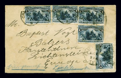 680 c 230 image#230, 1c Columbian, five singles tied by Chicago duplexes on 1893 cover to Liechtenstein, Vaduz and Balzers backstamps, minor cover flaws, fine appearance; this is one of the rarest destinations in all of Europe. (Image) Est. 200-300