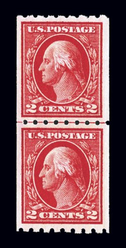 546 nh 413 image#413, 2c Carmine coil, Ty. I, perf. 8 1/2 vert., guide line pair, uncharacteristically well centered within large margins, prooflike color and impression, o.g., n.h., extremely fine; an especially scarce line pair in this choice condition; 1986 PF certificate. (Image) $625.00
