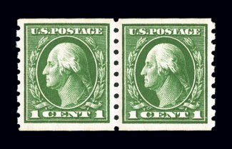 545 nh 412 image#412, 1c Green coil, perf. 8 1/2 vert., exceedingly well centered and margined, brilliantly fresh color on clean white paper, flawless o.g., n.h., extremely fine; 2002 PSE certificate (XF-Superb 95). (Image) $130.00