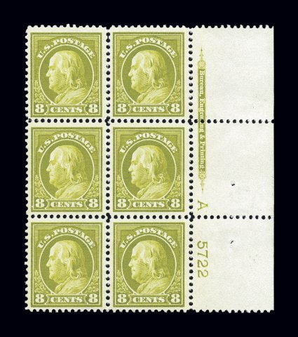 548 nhPB 414 image#414, 8c Pale olive green, beautiful full right margin imprint, "A" and plate no. 5722 block of six, possessing exceptional centering for a multiple and being wonderfully fresh with rich luxuriant color, unblemished o.g., n.h., extremely fine for a plate block. (Image) $775.00