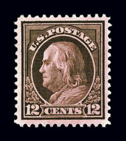 552 nh 417 image#417, 12c Claret brown, remarkably choice mint example, possessing flawlessly centering amid large margins, gorgeous deep luxuriant color, pristine o.g., n.h., extremely fine; an immaculate gem; 2003 PSE certificate. (Image) $110.00