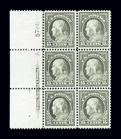 555 ogPB 418 image#418, 15c Gray, full left margin imprint, "A" and plate no. 5780 block of six, fresh color, well centered, o.g., lightly hinged, very fine. (Image) $675.00