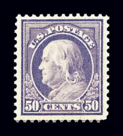 558 og 421 image#421, 50c Violet, single line watermark, near perfect centering, sumptuously rich color, o.g., barest trace of hinging (if at all), trivial corner crease at top left not mentioned on accompanying certificate, otherwise extremely fine; clear 1980 PF certificate. (Image) $425.00
