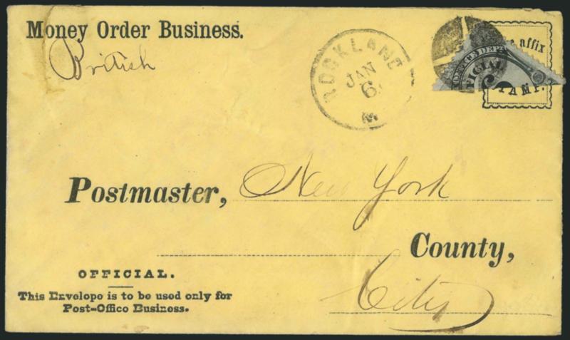 We record the following nine covers with the 6c Post Office bisect (all diagonal halves, as noted): C1) TR, Rockland Me. Jan. 6, to NYC, marked "British", ex Gibson, Starnes, the cover offered here, C2) TR, Rockland Me. Jan. 10, to NYC, marked "British", 1953 PFC, ex Ackerman, Ehrenberg, Markovits, C3) BL, Rockland Me. Jan. 10, to NYC, marked "British", 2003 PFC, ex Markovits, C4) BR, New York Mills NY Apr. 10, to Concord Mass, 1993 PFC, ex Hughes, Ward, Markovits, C5) TL, Galveston Tex. May 19 (1883?), intra-city address, 1978 PFC, ex Markovits, C6) TR, Rockland Me. Jan. 10, to NYC, Miller collection NYPL, C7) BR, Lockport NY Sep. 30, on 3c UO7 entire to Elmira NY, Miller collection NYPL, C8) TR, Shenandoah Va. Apr. 2, to NYC, Miller collection NYPL, and C9) BL, Rockland Me. Jan. 7, to NYC, ex Ehrenberg. In addition to complete covers, there are two pieces: P1) TL (see No. P2 for other half), Niagara Falls NY, Jun. 18, on 3c UO7 cut square, ex Markovits, P2) BR (see No. P1 for other half), Niagara Falls NY, Jun. 18, with 3c O49 on 6c UO12 cut square, ex Markovits. The Miller collection at The New York Public Library also contains two 3c UO7 cut squares with bisects of the 12c Post Office (both used from Lockport N.Y. on Nov. 28).