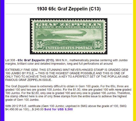 1930 65c Graf Zeppelin (C13) - Top 10 prices paid for examples in N.H., O.G., unused, used, multiples, pairs and on cover.