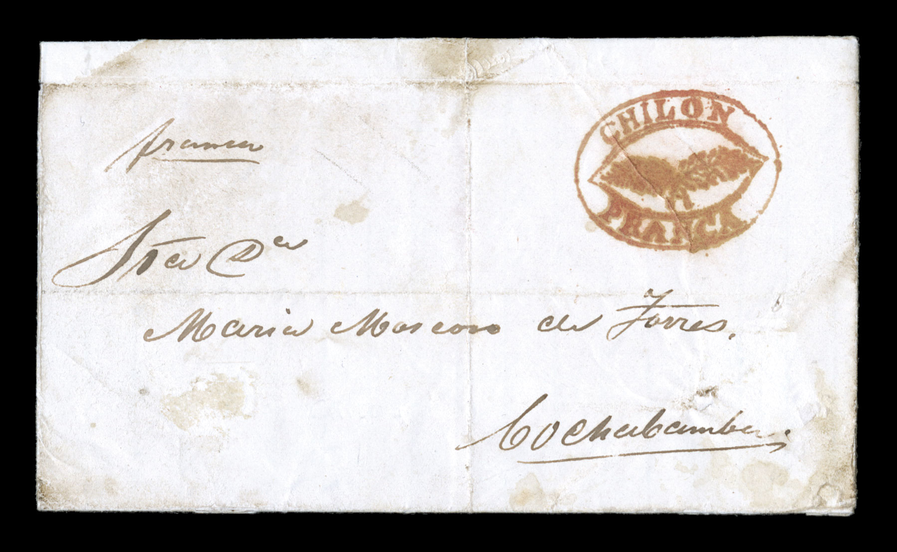 adhesives, all written up and mounted on pages in three deluxe custom albums,1832-78 Litoral Department stampless cover collection of 60 covers, most being entire folded letters, three fronts and two postal documents plus a couple of covers with adhesives, all written up and mounted on pages in three deluxe custom albums, this department is important for two reasons, first, it consists of the coastal regions of Bolivia containing the ports that gave Bolivia the most contact with the outside world, thus many of the rare ship markings and foreign usages come out of this area, second this is the department that was lost to Chile in the 1879 war with that country and is part of Chile to this day, so this traces out the history of that area in the early period while it was still part of the country of Bolivia, one of the earliest ports was Lamar with straight line handstamps as early as 1832 with a number of internal covers being the name of the Bolivian post office in this town, as well as a packet cover to France and similar inbound cover from France, closely connected with Lamar is Cobija which was another name given to this port and used by the British Postal Agency in Bolivia, includes three packet covers to France from Cobija including one with the scarce Cobija British c.d.s., another major port was Antofagasta, or also known as La Chimba, some very scarce markings come from here including the rare fancy "Cancelado" oval and the "Correos de La Chimba/Bolivia" pictorial ship postmark, these two markings were often used together, of the twelve covers and one front of La Chimba, ten have the "Cancelado" marking and ten with the ship marking, most are going to Chile though the front is a scarce posting to Uruguay, also from Antofagasta is found the fancy "Correo 10c Antofagasta" ornate frank handstamp which was applied as many times as needed to equal the postage, this collection includes five covers to Chile with this rare marking, three with single strikes and two with two strikes paying the 20c rate, besides these large ports there are also covers from smaller towns as Atacama, Calama, Mejillones and Tocopilla, etc., condition varies but for the most part the covers are very attractive and fine-very fine or better with many rare items present; a wonderful study of this hotly contested area between Bolivia and Chile. (imagea) (imageb) (imagec) (Image) Est. $5,000-7,500