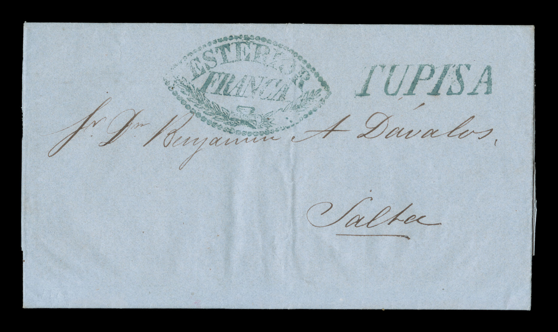 signature, in addition to the Tupisa straight line handstamp this cover al"Tupisa" blue straight line handstamp, Department of Potosi, another foreign mail cover to Salta, Argentina including a portion of the letter that has Gregorio Pacheco's signature, in addition to the "Tupisa" straight line handstamp this cover also has the rare "Esterior/Franca" ornate oval foreign mail marking plus an additional straight line "Franca", all in blue, very fine and rare. (Image) Est. $400-500