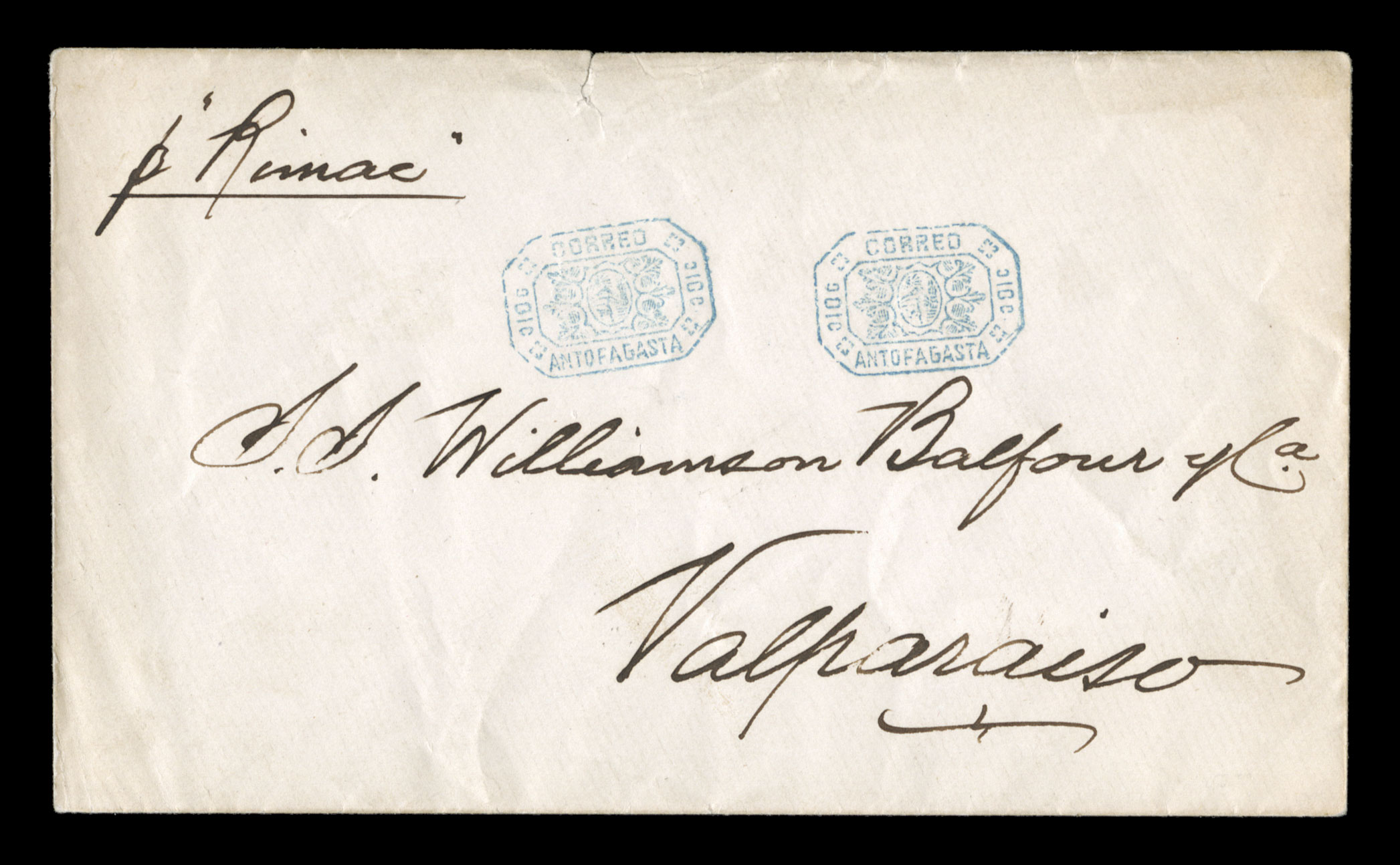 multiple rate cover, backstamped, edge wrinkles from large enclosure (not"Correo/Antofagasta/10c" blue ornate octagonal frank, Department of Litoral, four clear strikes of this frank paying a 40c rate on an 1878 cover to Valparaiso, Chile for a multiple rate cover, backstamped, edge wrinkles from large enclosure (not included) and two tears at top, one just touching one marking, fine; since a letter could be sent to Chile for as little as 10c it is presumed that this is a quadruple rate and it is the only example known to the collector with four strikes of the postmark. (Image) Est. $1,500-2,000