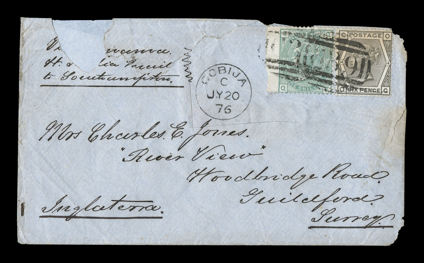 with Great Britain franking, one with 6p Grey, plate 14 and wing-margin 1Cobija (Lamar) British Postal Agency c.d.s. Department of Litoral, a pair of 1876 covers from the same correspondence posted directly at the British post office in Bolivia with Great Britain franking, one with 6p Grey, plate 14 and wing-margin 1/- Green, plate 10 (S.G. #Z8, Z10; edge fault to to the wing margin) tied by "C39" numeral in oval of bars with "Cobija/C/JY 20 76" British c.d.s. beside, the other with a rather attractive 1/-Green vertical strip of three, plate 10 (S.G. #Z10) tied by two bold strikes of the "C39" cancel of this office, the two covers were posted in the same manner to Guilford, England arriving about two weeks apart in August of that year, both marked "via Panama/pe. W. I. Mail/to Southampton" and backstamped, both also have had a piece with the stamps cut from the cover and rejoined with hinges, the Cobija cancel is included on the piece with the stamps, despite the condition these two covers are of the greatest rarity being two of only a handful of covers known from this British post office in Bolivia at Cobija with Great Britain stamps. (imagea) (Image) Est. $1,500-2,000