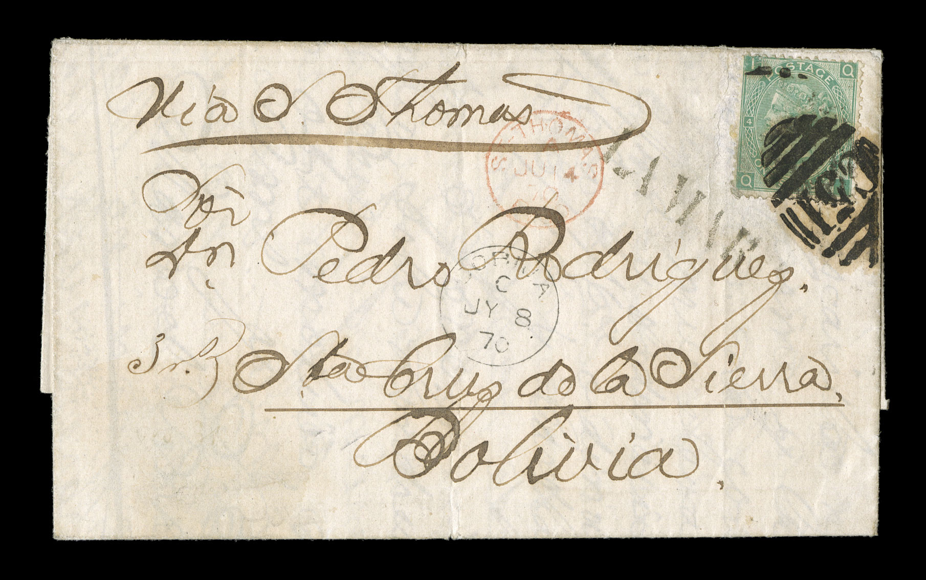 of La Chamba tying a Great Britain 6p Grey, plate 14, right wing-mar"Correos de la Chimba/Bolivia" negative black ship illustrated handstamp, Department of Litoral, an unusual 1875 cover to England with two full strikes of this rare ship marking of La Chamba tying a Great Britain 6p Grey, plate 14, right wing-margin strip of three, matching black ornate "Cancelado" and boxed "Franca", the routing of this cover is a bit unusual in that it has a September 25th Valparaiso c.d.s. on the reverse and ms. per "Liguira", the collector noted that this was sent via this ship of the Pacific Steam Navigation Company for direct transmission from Valparaiso to Liverpool, however it also has a British post office Callao c.d.s. of October 6th where it evidently entered the British system and it is unclear why it went so far south to only go back north again, backstamped Liverpool, small edge flaws to the left stamp otherwise very fine and attractive; a very rare combination of the Bolivian post office and the British Postal Agency. (Image) Est. $2,000-3,000