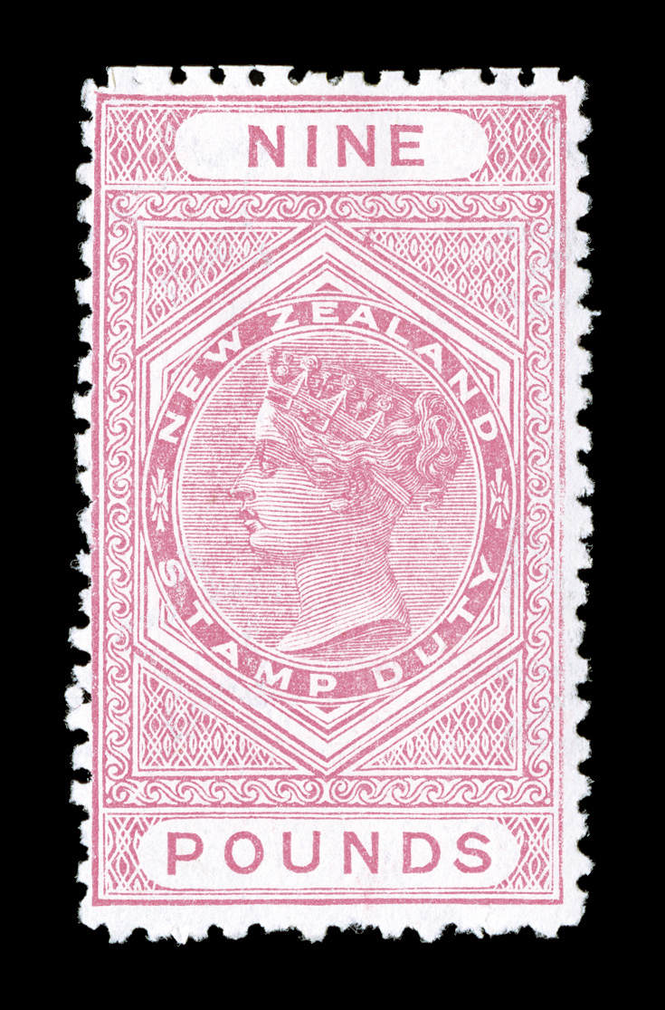 include a mix of watermarks including at least four that are the NZ anScott #AR16/30, etc., 1882-1903 25/- to £10 Postal fiscals, fourteen different values, with all denominations represented except the £2 which is offered separately, the stamps include a mix of watermarks including at least four that are the NZ and star far apart, strong rich colors throughout, all are o.g. except the £5 may be regummed, a few small flaws, two values with trivial toned spots, overall a fine representation of these high values, which are almost never found in mint condition, let alone as a nearly complete group such as this; the £10 is accompanied by a 1992 BPA certificate, the 25/- with a 1996 Rendon certificate, and eleven other values (all but the £4) are accompanied by a clear 1992 Rendon certificate. (imagea) (Image) Est. $3,000-4,000
