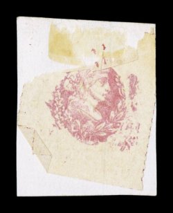 paper, very fine an extremely rare First Issue essay.Turner Essay 54, 2c Bank Check, die essay in orange on India, 40x48mm, light translucent stain in the top margin from a previous hinge, which often occurs on this frail India paper, very fine; an extremely rare First Issue essay. (Image) Est. $750-1,000