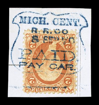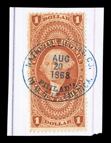 887 c Postage issues used as revenues, 28 documents with postage stamps used to pay the revenue, including a couple with mixed revenue frankings, majority is 1861 Issue, including seven with 2c Black Jacks and one with 5c (#76), 1869 Issues include one with 2c and one with a pair of 6c (seldom seen used as a revenue), others are mostly Bank Notes, but we do note one with a 2c Trans-Mississippi and another with the 8c Bureau Issue on a lovely engraved railroad stock certificate, majority fine or better. Est. $400-500