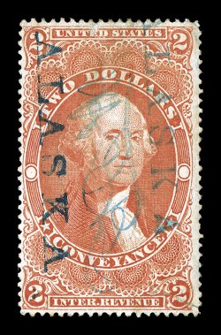 892 c Revenues on documents lot of a couple hundred, includes several from the Second Issue, a few Third Issue including a $20.00 value, plus many later including a large number of the Battleship types, many of these on railroad documents but also a couple bisects noted, plus there are some documents without revenue stamps (many railroad related), overall a fine-very fine group that could hold a few surprises. Est. $500-750