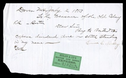 Express Co. (Attica, Ind.) used along with 1c Express revenue stamp on U.SExpress labels on documents, six items, including Amercian Express Co. (Erie & Pittsburgh route) on back of cover, American Express Co. (Lafayette, Ind.) and United States Express Co. (Attica, Ind.) used along with 1c Express revenue stamp on U.S. Express Co. receipt, plus Plummer & Fogg's, Niles & Co's (Boston and Dover), Marshall & Moulton's and Page & Saville's, each on a handwritten note, fine-very fine group. (imagea) (imageb) (imagec) (Image) Est. $200-300