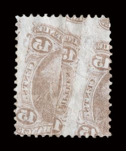 the largest known multiple of this stamp, being one of only four (al#R122, $1.90 Blue and black, horizontal pair, bright colors, 1872 ms. cancels, extra horizontal perforation through the stamps (probably made at a later time), fine; a pair is the largest known multiple of this stamp, being one of only four (all horizontal) in the Curtis census. (Image) $850.00