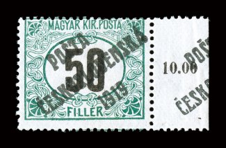 2f value were printed signed J. Mrnak and others, and accompanie#B111, 1919 2f Green and black with "Posta/Ceskoslovenska/1919" overprint, well centered, rich color, o.g., lightly hinged, very fine; only a total of 195 of both watermarks of the 2f value were printed; signed J. Mrnak and others, and accompanied by a 1995 Mikulski certificate (Michel #146; €700). (Image) $700.00