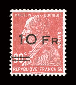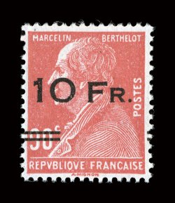 paper, o.g., the 1.50Fr has just the barest trace of hinging, fine-ve#C3-4, 1928 10Fr on 90c and 10Fr on 1.50Fr "Ile de France" air post cplt., the 90c being a left sheet-margin single, wonderfully fresh, with strong bright colors on crisp white paper, o.g., the 1.50Fr has just the barest trace of hinging, fine-very fine; a most attractive set of these rare and popular air posts; each signed Friedl where he identifies the positions as 16 and 34 respectively (Yvert #A3-4; 14,700). (imagea) (Image) $10,050.00
