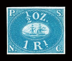 rarely encountered), latter unused, each with a minor thin spot, 2R with#1-2, 1857 1R Blue and 2R Brown red Pacific Steam Navigation Co., both with four ample to large margins, strong rich color and impression, former with original gum (which is rarely encountered), latter unused, each with a minor thin spot, 2R with tiny closed tear, very fine appearance; overall a desirable set of this scarce and popular first issue; both accompanied by 1991 PF certificates. (imagea) (Image) $2,600.00