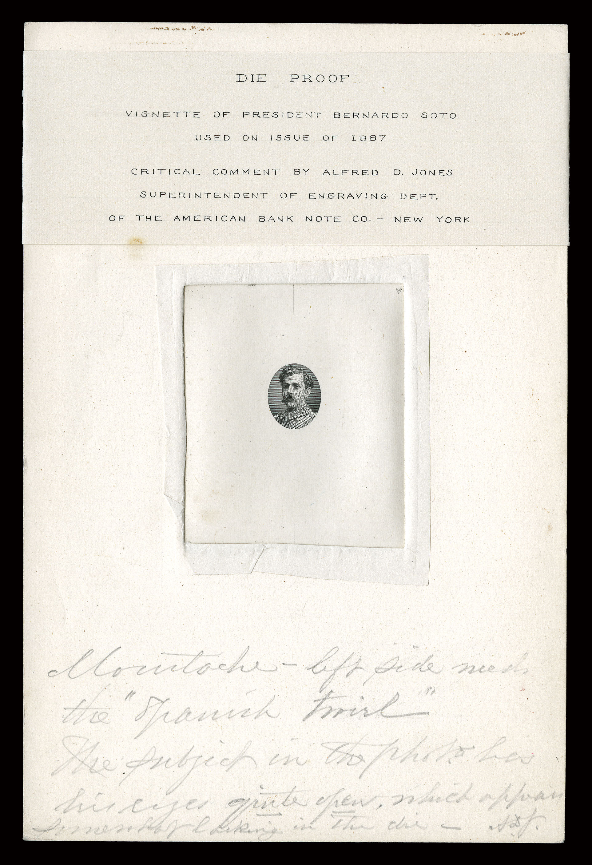 is is the retouched state with with inscriptions at bottom, very fine#21E, Large die vignette essays, two die sunk on 149x225 cards, one is the first state of the vignette, with ms. pencil notes on card describing the needed changes, the second is is the retouched state with with inscriptions at bottom, very fine; accompanying the lot is a signed note from President Soto. (imagea) (Image) Est. $400-500