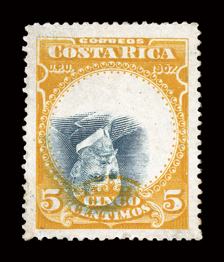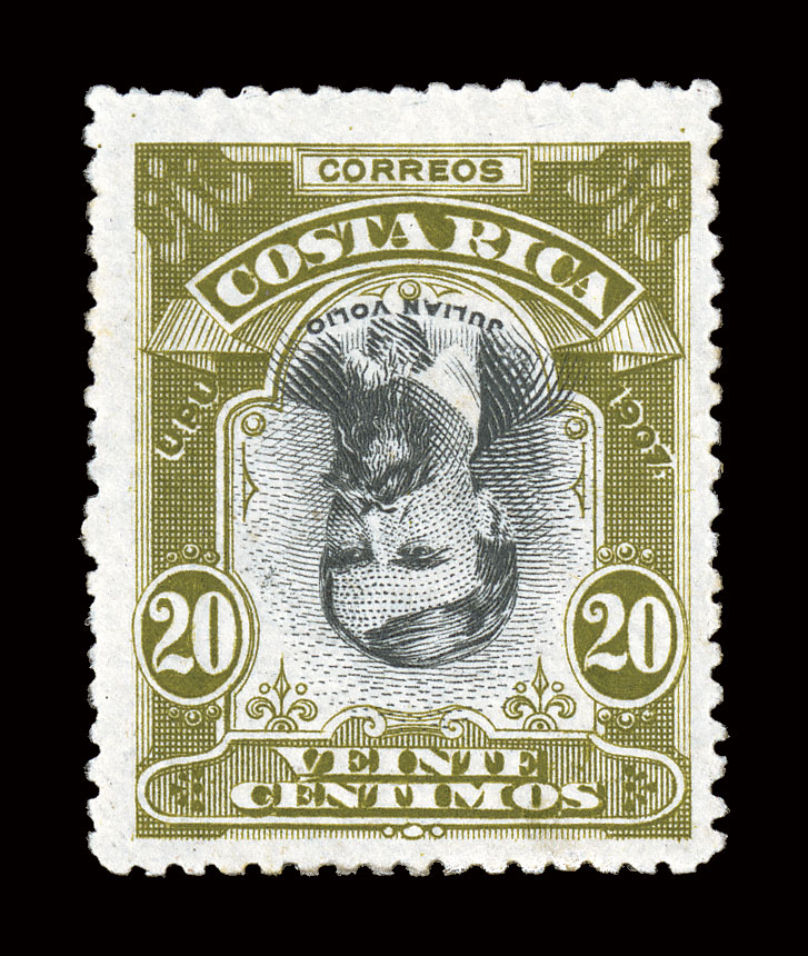 decades. Its first public appearance was in the 1935 sale of the Arthur#46 var., 1901 2c Vermilion and Black, Center Inverted, fresh color, nicely centered, o.g., very fine.Although not listed in Scott, this invert has been well known for many decades. Its first public appearance was in the 1935 sale of the Arthur Hind collection, where it realized £4/10. This is the only recorded example of any value of this series with an inverted center.Certainly one of the most important 20th century errors of Costa Rica, as well as being an essential stamp for a serious collection of inverted centers of the world; signed H. Bloch and accompanied by a 1980 RPS certificate; ex-Hind. (Image) Est. $5,000-7,500