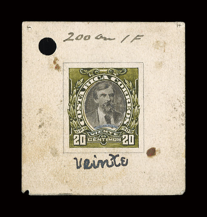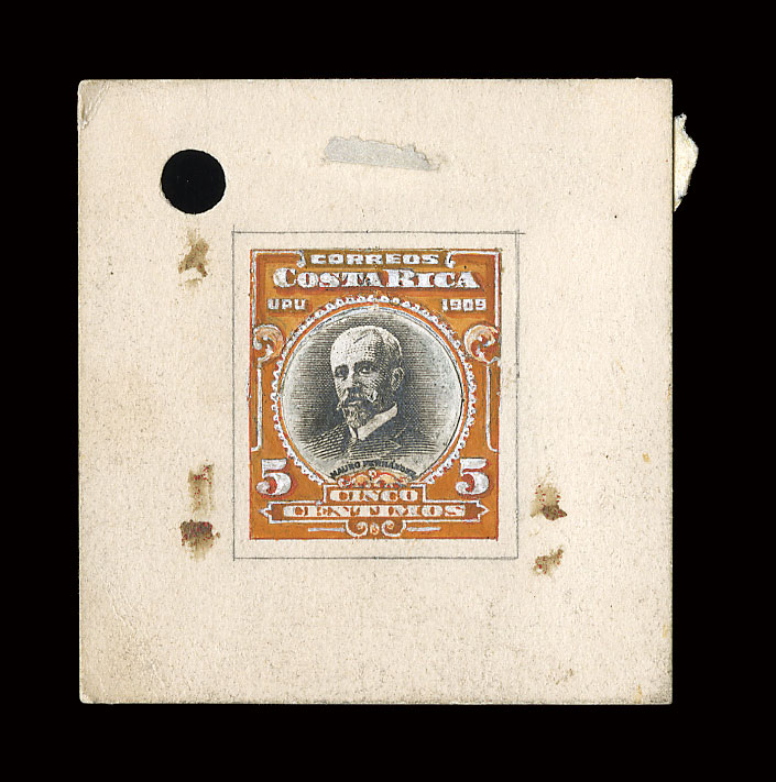 proofs for the centimos values in rose and sepia, eleven different sm#212P-16P, C74P-80P, 1941 5c-5Col University, file production, includes three enlarged photographic and handpainted models, two stamp size photographic models, large master die proofs for the centimos values in rose and sepia, eleven different small die proofs mounted on card, plus layout sheets, worksheets and a couple photographs, fine-very fine; ex-American Bank Note Company archives. (Image) Est. $400-500