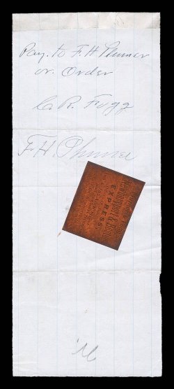 Express Co. (Attica, Ind.) used along with 1c Express revenue stamp on U.SExpress labels on documents, six items, including American Express Co. (Erie & Pittsburgh route) on back of cover, American Express Co. (Lafayette, Ind.) and United States Express Co. (Attica, Ind.) used along with 1c Express revenue stamp on U.S. Express Co. receipt, plus Plummer & Fogg's, Niles & Co's (Boston and Dover), Marshall & Moulton's and Page & Saville's, each on a handwritten note, fine-very fine group. (imagea) (imageb) (imagec) (Image) Est. $500-750