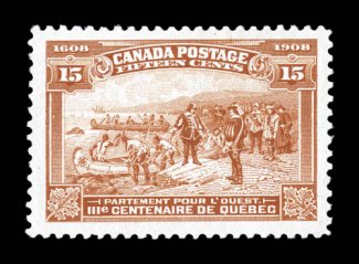stamp to find in this gem never hinged condition 2000 PF certificat#102, 1908 15c Quebec Tercentenary, wonderfully well centered within incredibly large margins, warm rich color, unblemished o.g., n.h., extremely fine; actually a very difficult stamp to find in this gem never hinged condition; 2000 PF certificate (Unitrade C$1,050.00). (Image) $500.00