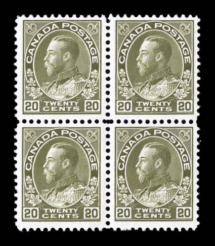 bright colors throughout, o.g., n.h., one 5c Blue stamp has a trivi#106/122, 1911-25 2c-$1.00 "Admirals", complete in blocks of four from the 2c-$1.00 values less only the 10c Plum, all are well centered (some exceptionally so), with wonderfully bright colors throughout, o.g., n.h., one 5c Blue stamp has a trivial rust spot on gum, very fine-extremely fine; a highly desirable set of blocks (Unitrade C$13,920.00+). (imagea) (Image) $7,720.00+