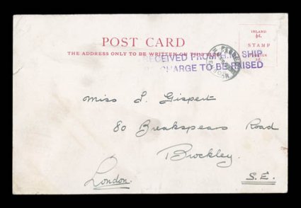 Georgia), outstanding strike on the address side of a real photo postcS.G. #PH3a, 1912 "Paid 1 At South Georgia/JIW provisional handstamp, with large "A" of "At" and manuscript initials "J.I.W." (James Innes Wilson, Assistant Postmaster at South Georgia), outstanding strike on the address side of a real photo postcard (depicting a whaling ship), addressed to Norway, overstruck as always by "South Georgia/Feb 14/12" c.d.s., very slight soiling and the picture side a bit faded, overall very fine; all South Georgia provisional handstamps are rare, but the type with "J.I.W." initials is especially desirable, this being only one of seven recorded examples by Heijtz, most of this minimal quality are with the 2 1/2d rate. (Image) £7,500