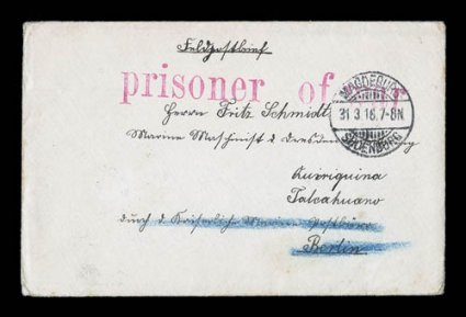 aggressively accumulating additional material to augment the Prappas exhiThe 1914 Battle of the Falkland Islands auxiliary collection/accumualtion, the consignor after acquiring the previous lot from the Prappas sale as an excellent basis, began aggressively accumulating additional material to augment the Prappas exhibition collection, from many different sources he acquired approximately 250 additional covers or picture post cards all relating the battle (several at considerable cost in the $100 to $750 range), about one-third of the items are scarce to rare covers including unusual Prisoner-of-War covers, covers posted on board various German (largely) and British warships either during the time of the war, or in the case of the German Naval covers, many are from other theaters but all were at one time involved in the Battle of the Falklands, there is a breathtaking array of picture post cards and photos of battle scenes and of the warships involved; this accumulation, combined with the previous lot, would undoubtedly be the basis for a gold-medal level exhibition collection of this important and popular military event of the early 20th century; examination essential to fully appreciate the comprehensiveness and desirability of both this lot, and the previous one. (imagea) (imageb) (imagec) (Image) Est. $3,000-4,000