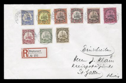well as an additional 3pf, all tied by Stephansort18 1011 c.d.s. post#7-19, 1900 3pf-5M Kaiser Yachts cplt., tied to two registered covers to St. Gallen, Switzerland, one cover has the 3pf-80pf values, while the other has the 1M-5M values as well as an additional 3pf, all tied by "Stephansort/18 10/11" c.d.s. postmarks, with registry labels, covers and stamps are particularly fresh, very fine; 2000 Steuer certificate (Michel #7-19). (imagea) (Image) Est. $400-500