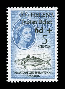 hinged, extremely fine (S.G. 171 var.)#B1 var., 1961 2 1/2c + 3p Tristan Relief semi-postal, broken "A" in "Helena" variety, exceptionally well centered single of this distinctive and scarce variety, o.g., lightly hinged, extremely fine (S.G. #171 var.) (Image) S.G. £1,200+